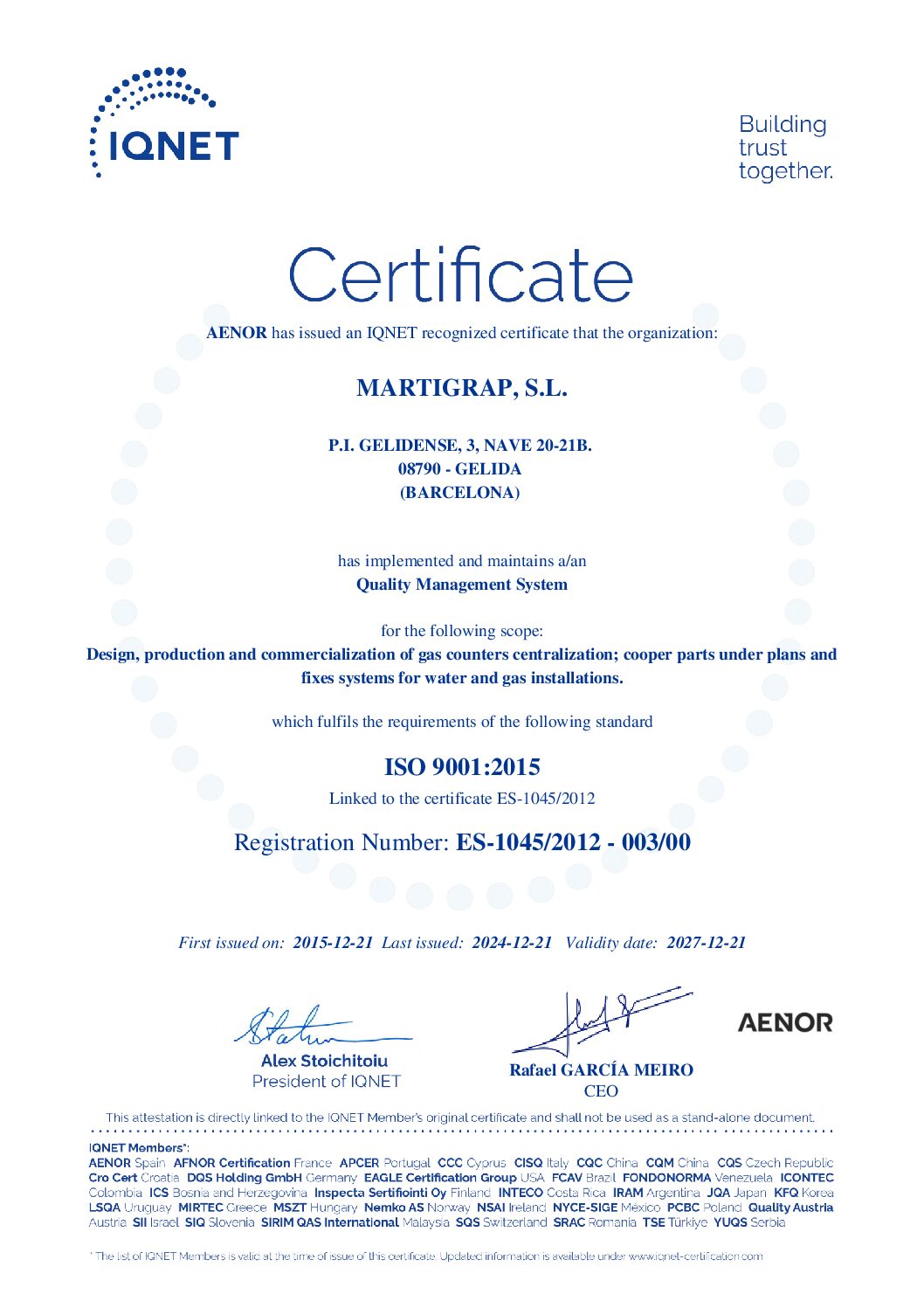 La certification AENOR N dans les centralisations des compteurs de gaz, ainsi que le certificat de système de gestion de la qualité accrédité AENOR, selon ISO 9001:2015, font que Martigrap évolue constamment en I+D et dans les nouvelles technologies.