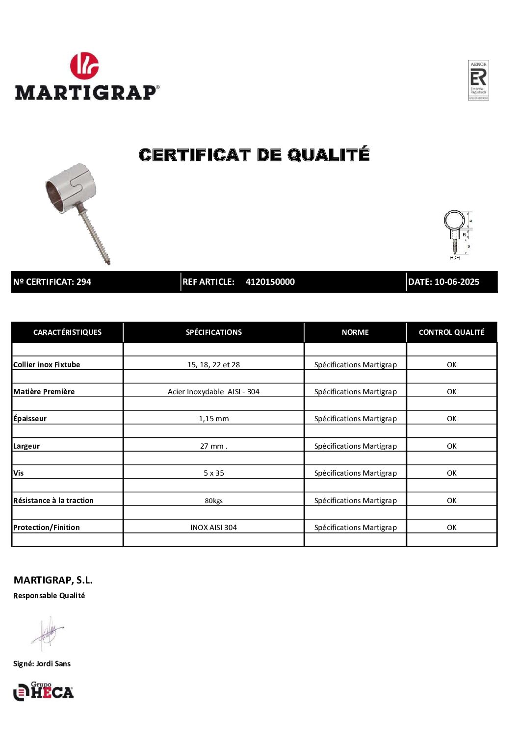 Certificat de qualité collier inoxydable Fixtube