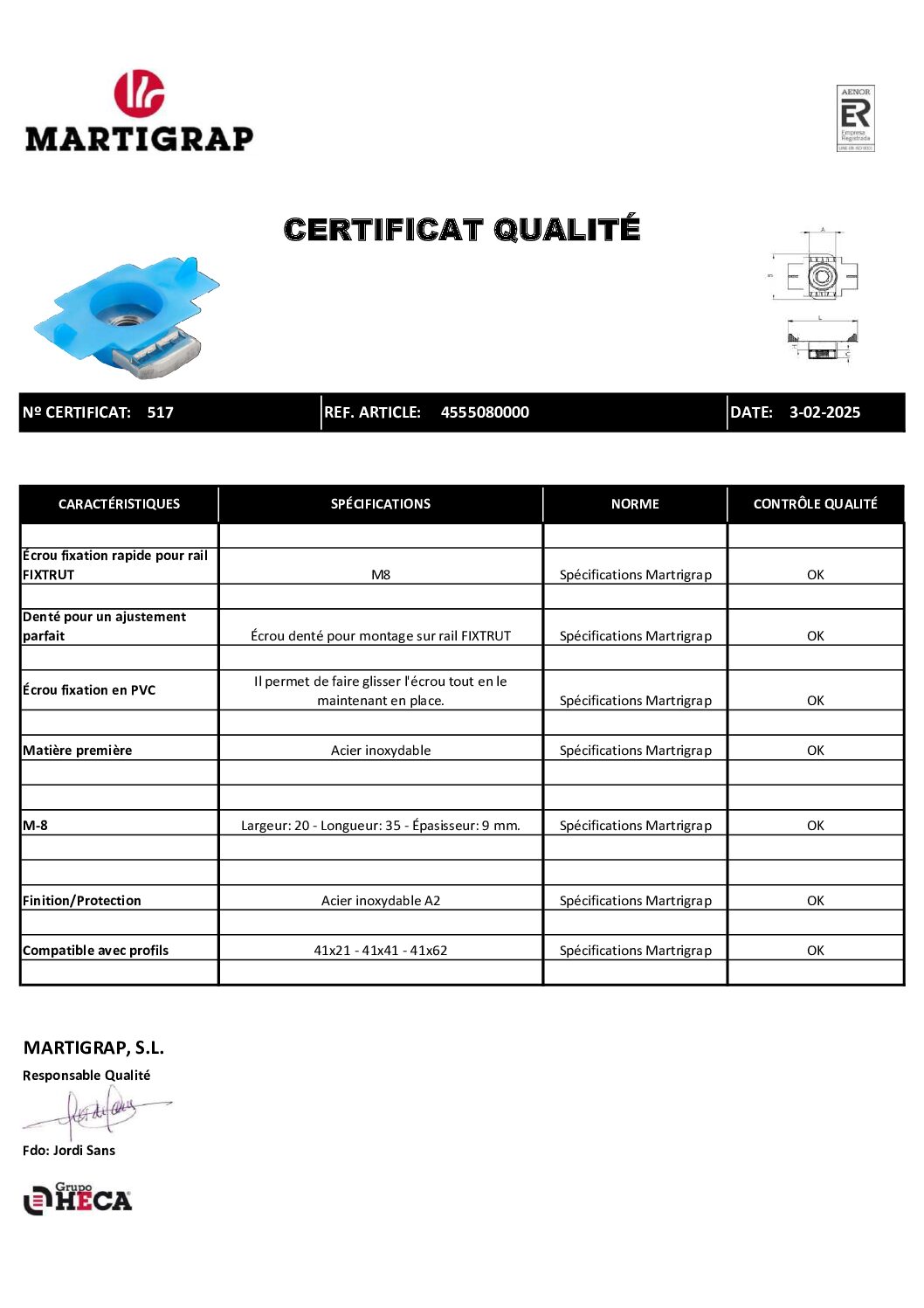 Certificat de qualité Écrou fixation rapide inoxydable pour rail Fixtrut