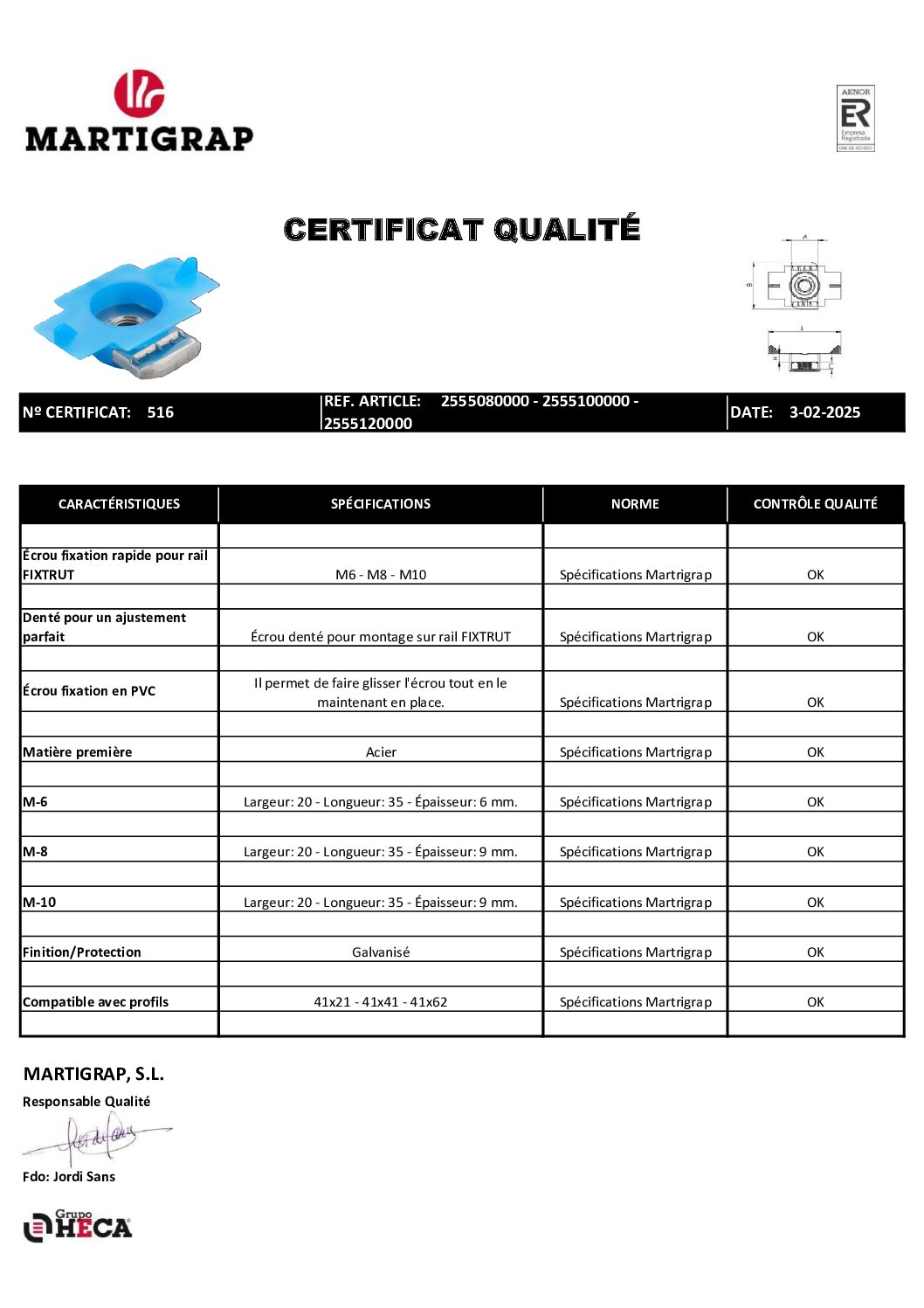 Certificat de qualité Écrou fixation rapide pour rail Fixtrut
